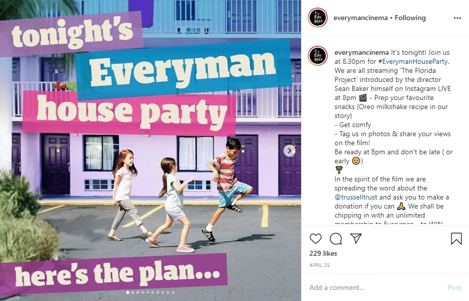 Everyman Cinemas are another group who have found creative ways to satiate the public need for cinema with their ‘House Party’ offering. They set a movie, a time, and a theme, encouraging people to get involved. Next they state where one can stream the selected movie. Previous films include _La La Land* with Emma Stone and Ryan Gosling, 500 Days of Summer starring Joseph Gordon-Levitt and *The Grand Budapest Hotel* with quite the panoply of actors including Ralph Fiennes, Saoirse Ronan and the ever enigmatic Jeff Goldblum.