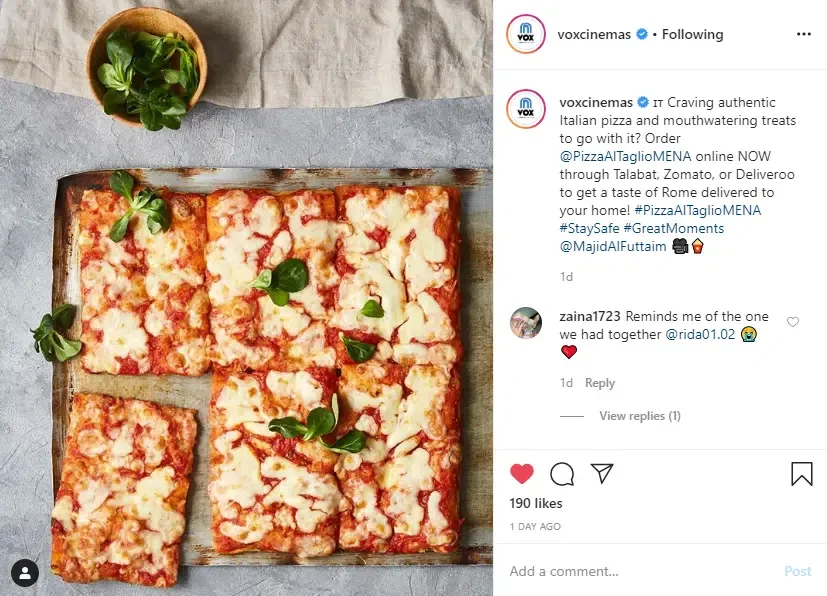 VOX Cinemas based in the MENA region has had to shut their cinemas due to the pandemic, but that hasn’t affected their food offering, as they have partnered with various home delivery services such as Deliveroo and Zomato to bring their extensive food and beverage offering to customers. Have a peek, their menu is far more than the typical popcorn and soft drinks! Just have a look at the pizza below…