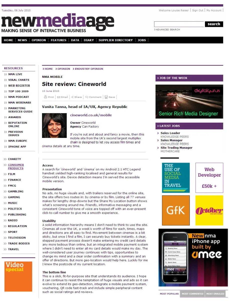 In 2010 Vanita Tanna, Head of Information Architects and User Experience at Agency Republic, described the site structure as a “well-considered user journey” with a “solid information hierarchy,” including “cinemas all over the UK, a week’s worth of films for each, times, maps and directions are all easy to find.”