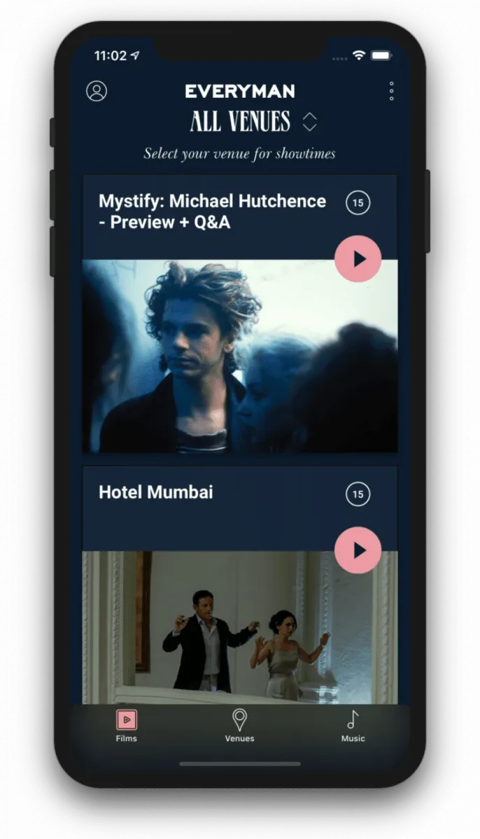 Parallelled with the unique user interface, Everyman’s iOS app’s UX allows users to book with ease and engage with all of the additional features. From the welcome splash screen of Twiggy, the striking typeface seen throughout the navigation, to the unique user experience, Everyman’s iOS app design stands out against its competitors. Venues can be selected via the Venue tab, and sorted by location and alphabetical order. Tab bar navigation provides users with instant access to Films, Venues and Music.